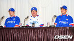 [OSEN=민경훈 기자] 15일 오후 서울 리베라호텔 15층 로즈홀에서 AG 야구대표팀 류중일 감독과 박병호 김광현이 기자회견을 가졌다. 9월 15일(월) 오후 4시 서울 리베라호텔(청담동)에서 선수단 소집을 시작으로 첫 공식 일정에 들