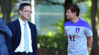 [OSEN=파주, 곽영래 기자] 18일 오후 경기도 파주 NFC(국가대표축구트레이닝센터)에서 진행된 아시안게임 축구대표팀 훈련에서 이광종 감독이 경기장을 찾은 이용수 기술위원장과 이야기를 나누고 있다. 한국이 강호 사우디 아라