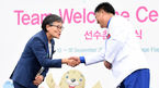 [OSEN=인천, 이대선 기자] 18일 오전 구월아시아드선수촌 국기광장에서 제17회 인천아시아경기대회에 참가하는 각국 선수단의 선수촌 입촌을 환영하는 입촌식이 진행됐다. 이에리사 선수촌장이 북한 김병식 단장과 악수를 나누