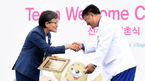 [OSEN=인천, 이대선 기자] 18일 오전 구월아시아드선수촌 국기광장에서 제17회 인천아시아경기대회에 참가하는 각국 선수단의 선수촌 입촌을 환영하는 입촌식이 진행됐다. 이에리사 선수촌장이 북한 김병식 단장으로부터 기념품