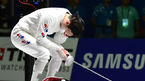 [OSEN=고양, 백승철 기자] 20일 오후 고양실내체육관에서 열린 제17회 인천 아시안게임 펜싱 남자 에뻬 개인 결승전, 정진선이 금메달 확정 후 고개를 떨구고 있다. / baik@osen.co.kr