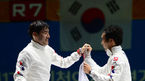 [OSEN=고양, 백승철 기자] 20일 오후 고양실내체육관에서 열린 제17회 인천 아시안게임 펜싱 남자 에뻬 개인 결승전 금메달을 차지한 정진선(왼쪽)과 은메달을 차지한 박경두가 하이파이브를 하고 있다. baik@osen.co.kr