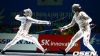 [OSEN=고양, 백승철 기자] 20일 오후 고양실내체육관에서 열린 제17회 인천 아시안게임 펜싱 여자 사브르 개인 준결승전, 이라진이 중국 리페이와 경기를 펼치고 있다. 김지연(익산시청)과 이라진(인천중구청)이 2014 인천 아시안게