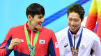 [OSEN=인천, 백승철 기자] 21일 오후 인천 문학박태환수영장에서 열린 제17회 인천 아시안게임 남자 자유형 200m 결승 시상식에서 박태환이 하기노 고스케를 바라보며 미소를 짓고 있다. 박태환(인천시청)이 남자 자유형 200m 3연속