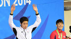 [OSEN=인천, 백승철 기자] 21일 오후 인천 문학박태환수영장에서 열린 제17회 인천 아시안게임 남자 자유형 200m 결승 시상식에서 하기노 고스케(금메달)가 두 손을 번쩍 들고 있다. 박태환(인천시청)이 남자 자유형 200m 3연속 우승