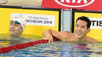 [OSEN=인천, 백승철 기자] 21일 오후 인천 문학박태환수영장에서 열린 제17회 인천 아시안게임 남자 자유형 200m 결승 종료 후 박태환이 쑨양을 바라보며 미소를 짓고 있다. 박태환(인천시청)이 남자 자유형 200m 3연속 우승 도전에