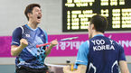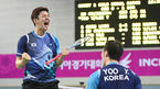 [OSEN=인천, 이대선 기자] 23일 오후 인천 계양체육관에서 2014 인천아시안게임 배드민턴 남자 단체전 결승전이 열렸다. 2경기 1세트에 승리한 이용대, 유연성이 환호하고 있다. 지난 2010 광저우아시안게임 당시 혼합복식의 신백철