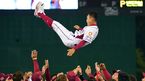 [OSEN=목동,박준형 기자] 8일 오후 서울 목동구장에서 열린 2014 한국야쿠르트 세븐 넥센 히어로즈와 삼성 라이온즈의 경기에 앞서 은퇴식을 가진 정수성이 동료들의 헹가래를 받고 있다 올 시즌 양팀의 상대 전적은 삼성의 8승6