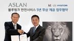[OSEN=강희수 기자] 현대자동차㈜와 KT가 이달 말 출시 예정인 아슬란에 블루링크 안전서비스를 5년 무상 제공하는 내용의 업무 협약(MOU)을 맺었다. 양사는 8일 현대차 국내영업본부(서울시 강남구)에서 현대차 곽진 부사장과 KT