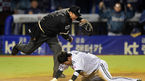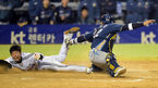 [OSEN=잠실, 지형준 기자] 24일 오후 서울 잠실구장에서 열린 2014 한국야쿠르트 세븐 프로야구 포스트시즌 준플레이오프 3차전 LG 트윈스와 NC 다이노스의 경기, 8회말 1사 3루에서 LG 황목치승이 이병규의 2루 땅볼에 홈에서 NC 김태