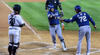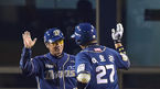 [OSEN=잠실, 곽영래 기자] 24일 오후 서울 잠실구장에서 열린 '2014 한국야쿠르트 세븐 프로야구' 포스트시즌 준플레이오프 3차전 LG 트윈스와 NC 다이노스의 경기, 6회초 1사 NC 이호준이 솔로 홈런을 때린 뒤 이광길 코치와 하이파이