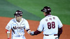 [OSEN=목동, 지형준기자] 28일 오후 서울 목동구장에서 열린 '2014 한국야쿠르트 세븐 프로야구' 넥센 히어로즈와 LG 트윈스의 플레이오프 2차전, 8회말 2사 1,2루에서 넥센 서건창이 1타점 적시타를 날리고 심재학 코치와 주먹을 맞