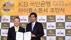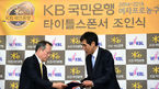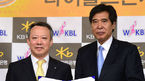 [OSEN=곽영래 기자] 'KB 국민은행 2014-2015 여자프로농구' 미디어데이 및 타이틀 스폰서 조인식 행사가 28일 서울 청담동 리베라호텔에서 열렸다. KB국민은행 박지우 은행장 대행(왼쪽)과 WKBL 신선우 사무총장이 타이틀 스폰서 조인