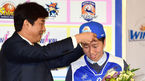 [OSEN=백승철 기자] 11일 오전 서울 여의도동 63컨벤션센터에서 열린 2015 WKBL 신입선수 선발회에서 1라운드 KB국민은행에 지명된 김진영이 서동철 감독으로부터 모자를 받고 있다. 이번 신입선수선발회는 고교 졸업 예정 선수 13명,