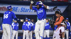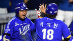 [OSEN=잠실, 손용호 기자] 11일 오후 서울 잠실야구장에서 열린 '2014 한국야쿠르트 세븐 프로야구 포스트시즌' 삼성 라이온즈와 넥센 히어로즈의 한국시리즈 6차전,6회초 무사 1,2루 나바로가 스리런 홈런을 치고 환호하고 있다.