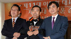 [OSEN=부산, 이대선 기자] 13일 오전 부산 사직야구장 강당에서 신임 이창원 대표이사와 이종운 감독의 취임식이 열렸다. 롯데 이윤원 단장, 이종운 감독, 이창원 대표이사가 기념촬영을 하고 있다. 보통 대표이사의 취임식이 끝