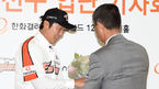 [OSEN=대전, 이대선 기자] 11일 오후 대전 갤러리아 타임월드 스카이홀에서 한화 이글스 FA 영입 선수(배영수, 권혁, 송은범) 입단식이 열렸다. 한화 송은범이 꽃다발을 전달하는 조인성에게 인사를 하고 있다. 한화이글스는 FA투수