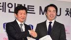 [OSEN=박준형 기자] 11일 오전 서울 신문로 축구회관에서 진행된 대한축구협회(KFA)와 SM엔터테인먼트 업무협약(MOU) 체결식에서 정몽규 회장과 김영민 SM엔터 대표가 협약서를 나누고 포즈를 취하고 있다. 대한축구협회가 엔터테인