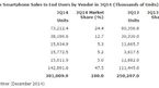 [OSEN=정자랑 기자]2014년 3분기에 전세계 스마트폰 판매량이 20% 증가한 가운데, LG전자는 중국 제조사 기세에 스마트폰 판매량 5위권 밖으로 밀려났다. 15일(현지시각) 영국의 시장조사기관 가트너는 지난 3분기 전세계에서 스마