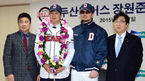 [OSEN=잠실, 곽영래 기자] 장원준 두산 베어스 입단식 및 기자회견이 7일 오후 서울 잠실구장에서 진행됐다. 두산 김태형 감독, 장원준, 오재원, 김승영 사장이 포토타임을 갖고 있다. 장원준의 계약 기간은 계약금은 40억에 연봉 1