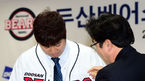 [OSEN=잠실, 곽영래 기자] 장원준 두산 베어스 입단식 및 기자회견이 7일 오후 서울 잠실구장에서 진행됐다. 두산 김태형 감독이 장원준과 포토타임을 갖고 있다. 장원준의 계약 기간은 계약금은 40억에 연봉 10억, 옵션 4억이다.