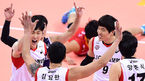 [OSEN=구미, 백승철 기자] 12일 오후 경북 구미시 박정희체육관에서 열린 '2014-2015 NH농협 V-리그' LIG 손해보험과 한국전력의 경기 1세트 LIG 선수들이 득점 후 기뻐하고 있다. 문용관 감독이 지휘하는 LIG 손해보험은 OK저축은행과 치