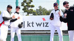 [OSEN=미야자키(일본),박준형 기자] 31일 kt위즈의 스프링 캠프가 차려진 일본 미야자키(宮崎)현 휴가(日向)시의 오쿠라가하마 구장에서 kt위즈 용병 옥스프링과 마르테, 필 어윈, 시스코가 포즈를 취하고 있다. 조범현 감독을 비롯
