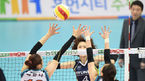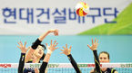 [OSEN=수원, 이대선 기자] 4일 오후 경기 수원실내체육관에서 '2014-2015 NH농협 V-리그' 여자부 현대건설과 GS칼텍스의 경기가 열렸다. 2세트 현대건설 양효진이 GS칼텍스 블로킹 벽을 피해 공격을 시도하고 있다. 승점 40점으로 2위를