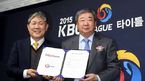 [OSEN=최규한 기자] 3일 오후 서울 도곡동 야구회관에서 'KBO 리그' 타이틀 후원 조인식이 열렸다. 후원사로 선정된 타이어뱅크 김정규 회장과 KBO 구본능 2015 시즌 엠블럼을 공개하고 있다. 2015 KBO 리그 타이틀 후원사는 ‘타이어뱅