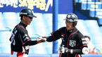 [OSEN=창원, 민경훈 기자] 11일 오후 경상남도 창원시 마산야구장서 ‘2015 타이어뱅크 KBO 리그’ 시범경기 NC 다이노스와 kt 위즈의 경기가 열렸다. 4회초 kt 김사연이 좌월 선취 솔로포를 날린 후 홈에서 김민재 코치와 하이파이브