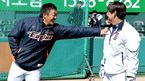 [OSEN=대전, 최규한 기자] 12일 오전 대전구장에서 열리는 '2015 타이어뱅크 KBO 리그 시범경기' 한화 이글스와 두산 베어스의 경기를 앞두고, 두산 홍성흔과 한화 임경완이 인사를 나누고 있다. 신생구단 KT가 합류하면서 올해부터 1