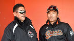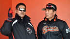 [OSEN=부산, 민경훈 기자] 12일 오후 부산 사직구장서 ‘2015 타이어뱅크 KBO 리그’ 시범경기 롯데 자이언츠와 kt 위즈의 경기가 열릴 예정인 가운데 양팀 훈련시간에 kt 조범현 감독과 롯데 이종운 감독이 kt 덕아웃에 나와 환하게