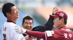 [OSEN=지형준 기자] 17일 오후 대전 한밭야구장에서 '2015 타이어뱅크 KBO 리그 시범경기' 한화 이글스와 넥센 히어로즈의 경기가 열렸다. 경기에 앞서 한화 오윤이 넥센 심재학 코치와 인사를 나누고 있다. 신생구단 kt가 합류하면