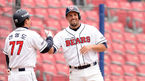 [OSEN=잠실, 김경섭 기자] 18일 서울 잠실야구장에서 '2015 타이어뱅크 KBO 리그 시범경기' 두산 베어스와 NC 다이노스의 경기가 열렸다. 3회말 2사 주자 1,3루 두산 홍성흔이 1타점 적시타로 1루를 밟고 기쁨을 나누고 있다. 지난 17일