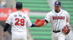 [OSEN=잠실, 김경섭 기자] 18일 서울 잠실야구장에서 '2015 타이어뱅크 KBO 리그 시범경기' 두산 베어스와 NC 다이노스의 경기가 열렸다. 2회초 2사 두산 루츠가 내야 땅볼을 처리, 이닝을 종료시키고 유희관과 기쁨을 나누고 있다.