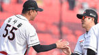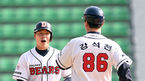 [OSEN=대전, 지형준 기자] 19일 오후 대전 한밭야구장에서 '2015 타이어뱅크 KBO 리그 시범경기' 한화 이글스와 롯데 자이언츠의 경기가 열렸다. 4회말 수비를 마치고 롯데 강민호와 심수창이 이야기를 나누고 있다. 신생구단 kt가 합