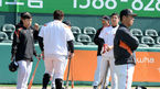 [OSEN=대전, 지형준 기자] 19일 오후 대전 한밭야구장에서 '2015 타이어뱅크 KBO 리그 시범경기' 한화 이글스와 롯데 자이언츠의 경기가 열렸다. 경기에 앞서 롯데 손아섭, 황재균이 훈련 지도중인 한화 김성근 감독을 바라보고 있