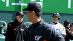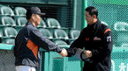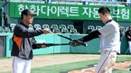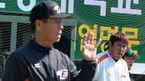 [OSEN=대전, 지형준 기자] 19일 오후 대전 한밭야구장에서 '2015 타이어뱅크 KBO 리그 시범경기' 한화 이글스와 롯데 자이언츠의 경기가 열렸다. 경기에 앞서 롯데 최준석이 훈련 지도중인 한화 김성근 감독을 바라보고 있다. 신생