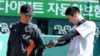 [OSEN=대전, 지형준 기자] 19일 오후 대전 한밭야구장에서 '2015 타이어뱅크 KBO 리그 시범경기' 한화 이글스와 롯데 자이언츠의 경기가 열렸다. 경기에 앞서 롯데 강민호가 훈련 지도중인 한화 김성근 감독을 바라보고 있다. 신생