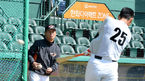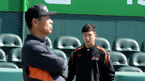 [OSEN=대전, 지형준 기자] 19일 오후 대전 한밭야구장에서 '2015 타이어뱅크 KBO 리그 시범경기' 한화 이글스와 롯데 자이언츠의 경기가 열렸다. 경기에 앞서 롯데 손아섭이 훈련중인 한화 김성근 감독을 바라보고 있다. 신생구단 kt