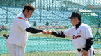 [OSEN=대전, 지형준 기자] 19일 오후 대전 한밭야구장에서 '2015 타이어뱅크 KBO 리그 시범경기' 한화 이글스와 롯데 자이언츠의 경기가 열렸다. 경기에 앞서 롯데 최준석이 한화 김광수 코치와 이야기를 나누고 있다. 신생구단 kt가