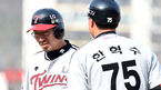 [OSEN=광주,이대선 기자] 29일 오후 광주-KIA챔피언스필드에서 진행된 '2015 타이어뱅크 KBO 리그' KIA와 LG의 경기, 5회초 무사에서 LG 정성훈이 내야안타를 치고 한혁수 코치와 이야기를 나누고 있다. KIA는 메이저리그 퍼펙트 투구를