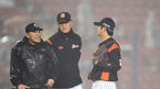 [OSEN=잠실, 김영민 기자] 31일 오후 서울 잠실구장에서 열린 '2015 타이어뱅크 KBO 리그' LG 트윈스와 롯데 자이언츠의 경기,7회말 2사 만루 롯데 염종석 코치가 임채섭 구심에게 마운드가 비로 인해 질척거리자 정비를 부탁하고 있
