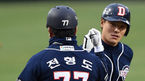 [OSEN=대전, 김경섭 기자] 1일 오후 대전 한화생명이글스파크에서 열린 '2015 타이어뱅크 KBO 리그' 한화 이글스와 두산 베어스의 경기, 1회초 두산 민병헌이 선두타자로 나서 솔로포를 치고 3루코치 전형도와 기쁨을 나누고 있다.