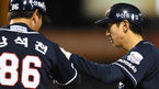 [OSEN=대전, 김경섭 기자] 2일 오후 대전 한화생명이글스파크에서 열린 '2015 타이어뱅크 KBO 리그' 한화 이글스와 두산 베어스의 경기, 5회초 2사 주자 1,3루 두산 정진호가 1타점 적시타를 치고 1루코치 강석천과 기쁨을 나누고 있