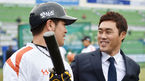 [OSEN=대구, 민경훈 기자] 8일 오후 대구시민운동장 야구장에서 '2015 타이어뱅크 KBO 리그' 삼성 라이온즈와 롯데 자이언츠의 경기가 열릴 예정인 가운데, 롯데 강민호와 조성환 KBS N 해설위원과 즐겁게 얘기를 나누고 있다. 이 날