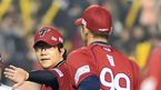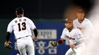 [OSEN=잠실, 김경섭 기자] 15일 오후 서울 잠실야구장에서 열린 '2015 타이어뱅크 KBO 리그' LG 트윈스와 KIA 타이거즈의 경기, 6회초 1사 주자 2루 LG 오지환이 KIA필의 타구를 처리하고 투수 김선규와 기쁨을 나누고 있다. 우천취소가