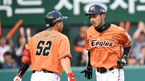 [OSEN=대전, 이대선 기자] 1일 오후 대전 한화생명이글스파크에서 '2015 타이어뱅크 KBO 리그' 한화와 롯데의 경기가 열렸다. 1회말 2사에서 한화 김경언이 중월 솔로홈런을 치고 홈에서 김태균과 하이파이브를 하고 있다. 한화는