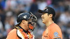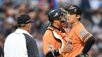 [OSEN=대전, 이대선 기자] 2일 오후 대전 한화생명이글스파크에서 '2015 타이어뱅크 KBO 리그' 한화와 롯데의 경기가 열렸다. 7회초 1사 1,2루에서 한화 조인성이 마운드를 내려가는 배영수를 격려하고 있다. 롯데는 좌완 레일리를 한