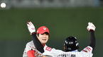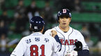 [OSEN=잠실, 김경섭 기자] 7일 오후 서울 잠실야구장에서 열린 '2015 타이어뱅크 KBO 리그' 두산 베어스와 LG 트윈스의 경기, 4회말 1사 주자 1루 두산 김재환이 1타점 적시 2루타를 치고 강동우 코치와 기쁨을 나누고 있다. 3연전 스윕